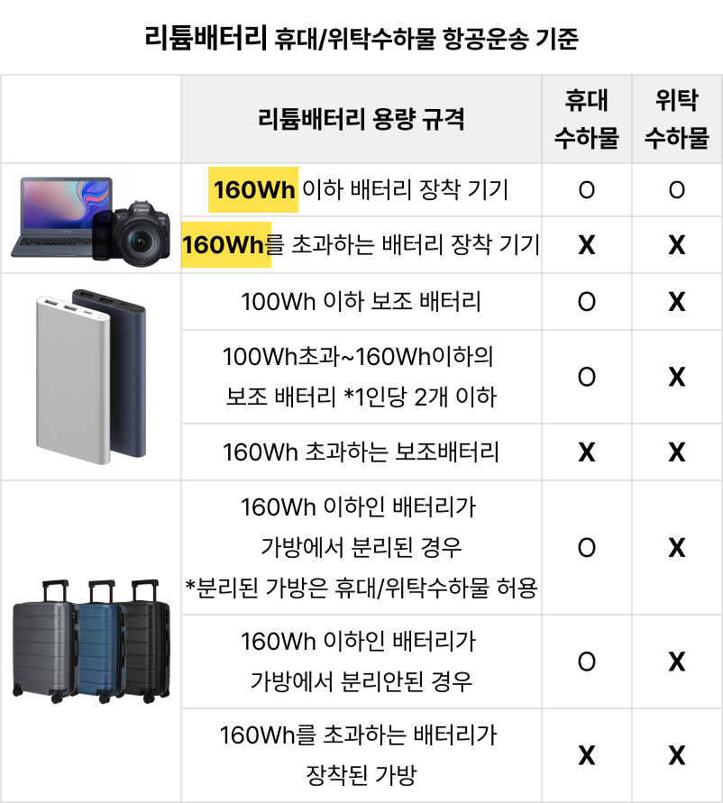 100Wh ~ 160Wh : 항공사 사전 승인 필요, 최대 2개까지 반입 가능